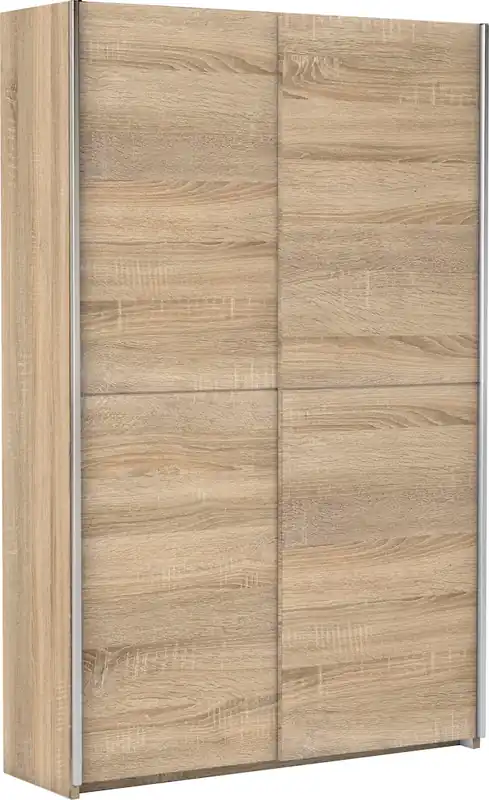Der Schwebetürenschrank im zeitlosen Design überzeugt durch viel Stauraum. Optisch präsentiert er sich in attraktiver und schlichter Farbkombination. Schöne Schwebetüren ergänzen die ansprechende Gestaltung. Der Schrank ist mit Scharnieren und Kleiderstangen aus Metall versehen. Durch seine geringe Tiefe ist er platzsparend und kann dadurch auch in kleinen Schlafzimmern aufgestellt werden. Ausgestattet mit mehreren Einlegeböden und einer Teleskopkleiderstange, bietet der Kleiderschrank viel Platz für Kleidung und Accessoires.