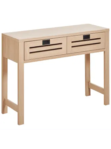 Stilvolle Konsole in heller Holzoptik mit geräumigen Schubladen. Das aus langlebiger Faserplatte gefertigte Möbelstück besticht durch seinen warmen und einladenden hellen Holzton, der sich leicht in jeden Einrichtungsstil einfügen lässt. Das klare und minimalistische Design enthält zwei Schubladen mit Lamellenfronten, die versteckten Stauraum für Ihre wichtigsten Gegenstände bieten. Die versenkten Griffe sorgen für ein schlichtes und aufgeräumtes Erscheinungsbild des Konsolentisches und machen ihn zu einer perfekten Ergänzung für jeden Raum, in dem Sie zusätzliche Aufbewahrungsmöglichkeiten benötigen.Details: Typ: Konsolentisch Farbe: Braun Material: Faserplatte Material Rand: Holzwerkstoff Gestellmaterial: Holzwerkstoff Tischplattenmaterial: Holzwerkstoff Schubladen: Ja Finish: Melamin Schutzkappen / Filzgleiter: Nein Schubladen: 2 Regalböden: NeinDimensions: Tiefe: 35 cm Breite: 100 cm Höhe: 75 cm Gewicht: 21 kg Max. Belastung der Schublade: 10 kg Max. Belastung der Oberplatte: 60 kgSie kaufen: 1x KonsolentischProduktvorteile: System des stillen Schließens von Schubladen, Passt ausgezeichnet zu vielen Einrichtungsstilen, Verleiht jedem Raum eine einzigartige Note, Qualitativ hochwertiges Material, Schutzkappen zum Schutz des BodensMontage: Nicht montiert. 45 – 60 Min.Zusatzinformationen: Um die Haltbarkeit und die Ästhetik der Arbeitsplatte zu erhalten, sollte man Platzsets und Untersetzer verwenden und feuchte Stellen schnellstmöglich trocken wischen, um Produktschäden zu vermeiden.Pflegeanleitung:Faserplatte: 1.Bitte ausschließlich milde Reinigungsmittel und weiche Tücher verwenden. Feuchte Stellen sofort trocken reiben.