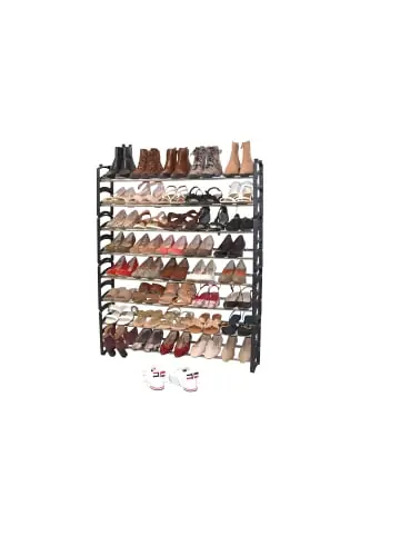 Praktisches Schuhregal mit Seitenteilen aus Kunststoff, die wahlweise schwarz, weiß oder grau eingefärbt sind. Jeweils mit verchromten, ausziehbaren Stahlrohren, auf denen je Etage ca. 5 Paar Schuhe Platz finden. Im Lieferumfang sind insgesamt 4 Regale mit jeweils 2 Etagen, die nebeneinander gestellt werden können, oder praktisch übereinander zusammengesteckt werden. Die Regale werden zur Selbstmontage, inklusive Aufbauanleitung angeliefert. Maße je Regal ca. cm: (B/H/T) 58-104/33/18.- Pflegeleichte Oberflächen- Platz bis zu 40 Paar Schuhen- Stapelbar oder nebeneinander stellbar