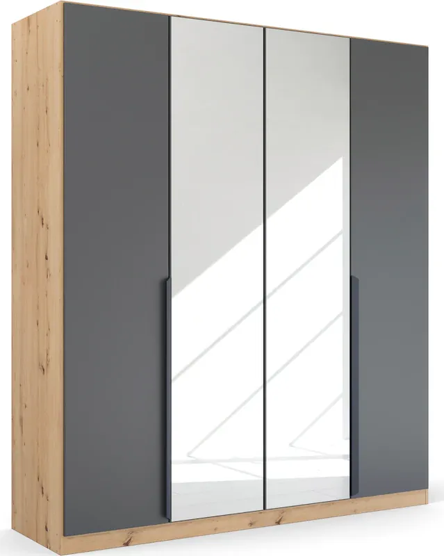 Moderne, lange Griffstangen in Graumetallic. Korpus in attraktivem, markant gemasertem Eiche Dekor. Moderner Industrial-Look mit vollflächig aufgelegten Spiegeltüren. Fachböden und Kleiderstangen können individuell eingesetzt und in der Höhe verstellt werden. 100% Made in Germany, ausgezeichnet mit dem Blauen Engel und dem Goldenen M