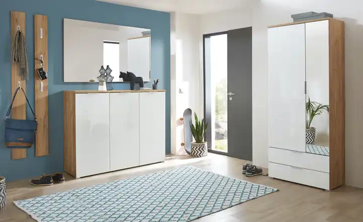 Bis zu 30 Paar Schuhe passen in den Schuhschrank Bent von uno. Sie werden hinter den drei Türen verstaut. Der Stauraum ist in 15 Fächer unterteilt. Praktisch: Die 12 Einlegeböden können Sie in der Höhe verstellen – und so die Größe der einzelnen Fächer nach Bedarf anpassen. Korpus, Böden und alle Innenflächen haben ein Dekor in Navarra Eiche (Nachbildung). Es verfügt über eine natürlich wirkende Maserung mit Farbverläufen. Die Front setzt sich in einem strahlendschönen Weiß ab. Die Oberfläche der drei Türen besteht aus Glas und hat einen leichten Glanz.