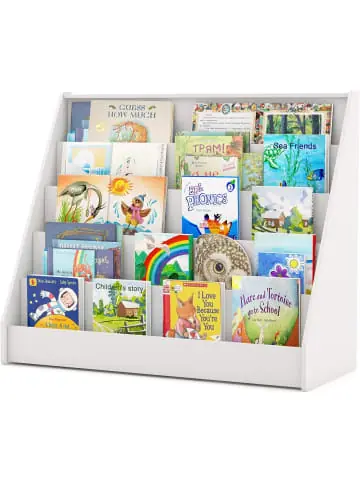 Beschreibung: Dieses Bücherregal ist mit Bedacht gestaltet, um großformatige Bücher aufzunehmen. Seine kinderfreundliche Höhe ermöglicht es auch den jüngsten Lesern, selbstbewusst ihre Lieblingsgeschichten zu greifen. Mit der vorderseitigen Anzeige ähnelt es einem kleinen Schaufenster, das Kinder ermuntert, sich in die Seiten ihrer Bücher zu vertiefen. Aus Sicherheitsgründen ist das Bücherregal mit einer Wandbefestigungsoption und rutschfesten Füßen ausgestattet, die für einen festen Stand sorgen. Ein vielseitiges Möbelstück, das jede Ecke im Zuhause oder im Kinderzimmer in eine gemütliche Leseecke verwandelt oder als Zeitschriftenhalter für Erwachsene dient.Eigenschaften:5-stöckiges Kinderregal mit großzügigem Stauraum für übergroße BücherRegale mit Vorderseitenanzeige fördern, dass Kinder öfter zum Buch greifen und lesenSicher für lebhafte Haushalte und Familien mit kleinen Kindern dank Umkippschutz-KitAusgestattet mit rutschfesten Fußpads für Stabilität und BodenschutzSorgfältig abgerundete Ecken schützen die empfindliche Haut von KindernFür verschiedene Orte geeignet, einschließlich Spielzimmer, Kinderzimmer und KindergartenDient auch als kleiner Zeitschriftenständer im Wohnzimmer oder ArbeitszimmerLeicht mit feuchtem Tuch zu reinigen für einfache PflegeVersteckter Stauraum auf der Rückseite für seltener genutzte GegenständeMaterial: HolzwerkstoffProduktabmessungen: 91 x 38 x 76,5 cm (L x B x H)Maße jedes Regalfachs: 88,5 x 5,5 x 9 cm (L x B x T)Geeignetes Alter: 3+Gewicht: 17 kgLieferungsumfang: 1 x Kinderbücherregal1 x Anleitung