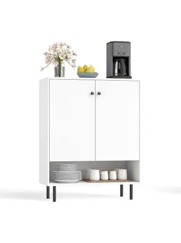 Beschreibung: Vielseitig und stilvoll – dieser Küchen-Buffetschrank ist ein wahres Stauraumwunder mit Arbeitsplatte, Schrank und Fach. Er hält wichtige Dinge stets griffbereit und sorgt für Ordnung. Ob Dekoration, Geschirr, Küchenutensilien, Lebensmittel oder Getränke – hier findet alles seinen Platz. Die stabile Konstruktion trägt bis zu 110 kg und wird durch zwei Kippschutz-Kits und Metallbeine zusätzlich gesichert. Das 5-fach verstellbare Regal lässt sich flexibel an unterschiedliche Gegenstände anpassen. Das moderne, schlichte Design mit abgedeckten Schraubenlöchern verleiht jedem Raum zusätzlichen Charme. Weitere benutzerfreundliche Details warten auf Sie.Eigenschaften: Breite Arbeitsplatte, geschlossener Schrank und offenes Fach Innenregal verstellbar oder herausnehmbar für unterschiedlich hohe Gegenstände 2 Kippschutz-Kits zur sicheren Wandbefestigung Metallstützbeine zur strukturellen Verstärkung 2-Türen-Design für bequemen Zugriff Praktische Griffe zum einfachen Öffnen der Türen Verstellbare Metallscharniere für präzise Türausrichtung Verbindungselemente mit Schrauben für zusätzliche Stabilität Abdeckungen für Schraubenlöcher für ein elegantes Gesamtbild 12 cm Bodenfreiheit für einfaches Reinigen Hinweis: Der Buffetschrank erfordert Montage Material: MDF, Holzwerkstoff Gesamtmaße: 75 x 35 x 95 cm (L x B x H) Maße des verstellbaren Regals: 72,5 x 32,5 cm (L x B) Innenmaße des Schranks: 72,5 x 32,5 x 56 cm (L x B x H) Höhe vom Boden: 12 cm Verstellabstand pro Regalposition: 3,2 cm Belastbarkeit der Arbeitsplatte: 50 kg Belastbarkeit pro Regal: 20 kg Nettogewicht: 19,5 kgLieferungsumfang: 1 x Buffetschrank 1 x AnleitungWarnhinweise Achtung: Befestigen Sie den Schrank sicher an der Wand, um das Kippen zu vermeiden.