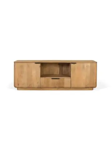 TV-Schrank aus Mangoholz in natürlicher Farbe, mit einem Design aus klaren Linien und abgerundeten Ecken, die dem Ganzen Weichheit verleihen. Es verfügt über zwei Seitentüren, eine untere mittlere Schublade und einen offenen Raum oben, ideal für elektronische Geräte. Die Metallgriffe sorgen für einen modernen und funktionalen Touch und bilden einen subtilen Kontrast zur Wärme des Holzes. Wood