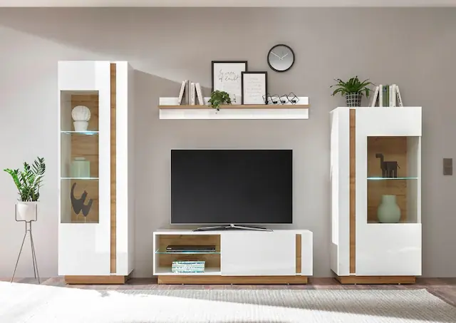 Set besteht aus 2 Vitrinen, 1 Lowboard und 1 Wandregal. Holzwerkstoff kombiniert mit Ganzmetall-Scharnieren für Langlebigkeit und Stabilität. Aus FSC®-zertifizierter Forstwirtschaft. Grifflose Fronten und Glastüren für ein modernes, elegantes Design. Wählen Sie aus verschiedenen Farbvarianten, um Ihre Wohnwand individuell zu gestalten