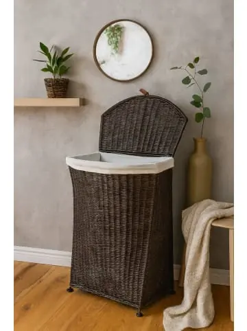 Hochwertiger Wäschekorb mit einem stabilen Eisengestell, mit Rattanrohr aufwendig handegeflochten. Unter dem aufgkappbarem Deckel befindet sich Stauraum für Wäsche. Innen ist der Korb zum Schutz der Wäsche mit einem herausnehmbaren Wäschesack, dank Klettverschluss, ausgestattet. Im Lieferumfang sind 2 Wäschesäcke (aus 65% Baumwolle/35% Polyester) in cremweiß und in schwarz, je nach Belieben verwendbar. Die Rattanoberfläche ist braun gebeizt und lackiert. Artikel wird montiert geliefert, einfach nur den passenden, farblichen Wäschesack einhängen. Maße ca. cm: B. 48 x T. 28 x H. 60 cm.- Pflegeleichte Oberflächen- Mit 2 Stoffeinsätzen- Handgeflochten