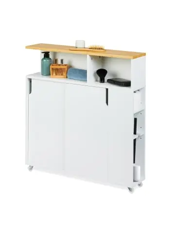 Der Rollwagen ist das perfekte Möbelstück für das Bad, um auch in engen Nischen und Ecken Stauraum zu schaffen. Mit 6 Fächern bietet das schmale Regal ausreichend Platz für Kosmetika, Putzmittel, und andere Badutensilien. Die Toilettenbürste passt in den seitlichen Halter. Die 3 verstellbaren Einlegeböden sorgen für eine flexibel Gestaltung der Fächer. Optisch überzeugt der rollbare Nischenschrank mit dem weißen Design und der natürlichen Bambusablage.Nischenschrank im Detail- Gesamtmaße H x B x T: ca. 79 x 17 x 75 cm – Offenes Fach links H x B x T: ca. 17 x 44,5 x 16 cm – Offenes Fach rechts H xB x T: ca. 17 x 27,5 x 16 cm – Fächerhöhen im Schrank: von ca. 8,5 bis 16 cm – Fächerhöhen an der Seite: von ca. 7 bis 29 cm – Traglast: ca. 18 kg – Gewicht: ca. 14 kg- Material: MDF, Bambus, PP-Kunststoff – Farbe: Weiß, NaturSchmales Nischenregal mit Rollen – Das Schieberegal ist ideal für schmale Badezimmer – Zum Verstauen von Kosmetik, Putzmittel und mehr – Regal passt dank geringer Breite perfekt in Nischen – Bietet viel Stauraum mit insgesamt 6 Fächern – Verstellbare Einlegeböden für flexible Fächergrößen – Mit praktischem Halter für die WC-Bürste – Mobil dank 4 Rollen zum leichten Verschieben- Design aus weißem MDF mit BambusablageLieferumfang – 1x Nischenwagen in Einzelteilen – Mit Anleitung – Mit Montagematerial – Dekoartikel sind nicht im Lieferumfang enthalten
