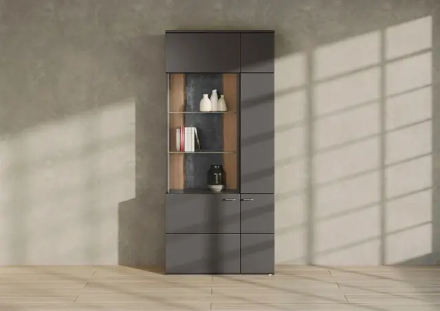 5 Jahre Hersteller-Garantie. 2 Türen. Sichtbare Rückwände aus Rindholz Eiche, massiv mit Elementen aus Schiefer Optik. Die Beleuchtung und der Trafo können dazu bestellt werden. Maße (B/T/H): 90/37,2/207,4 cm