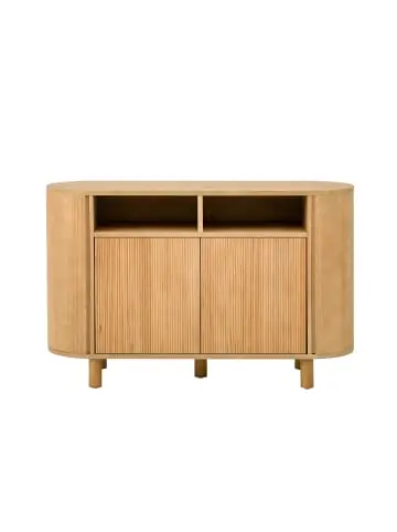 Sideboard mit 3D-Reliefstruktur & Rundbogenfach | 120×38 cm | Skandinavisches DesignDieses Sideboard besticht durch seine einzigartige 3D-vertikale Reliefstruktur und das besondere Rundbogenfach – eine harmonische Kombination aus skulpturalem Design und durchdachter Funktionalität.Skulpturales Design & weiche Ästhetik:3D-vertikale Reliefstruktur und durchgängig abgerundete Linien schaffen eine leichte, luftige Optik.Einzigartiges Rundbogenfach durchbricht die traditionelle eckige Form und bietet Platz für ungewöhnliche Gegenstände.Perfekt für skandinavische und modern-minimalistische Einrichtungsstile.Clever organisierter Stauraum:Kombination aus offenen und geschlossenen Fächern für flexible Aufbewahrung.Integrierter Flaschenhalter („kühlschrankähnliches Fach“) sichert Flaschen gegen Umfallen.Geräumiger Doppeltürschrank mit höhenverstellbaren Einlegeböden für Ordnungsboxen und Kleinteile.Scharniere mit großem Öffnungswinkel für leichten Zugang.Durchdachte Details & robuste Qualität:Abgerundete Ecken für mehr Sicherheit – ideal für Haushalte mit Kindern.Verstellbare Füße gleichen Bodenunebenheiten aus.Hohe Tragkraft: Arbeitsplatte 60 kg, Einlegeböden je 10 kg.Stabile MDF-Konstruktion mit hochwertiger Verarbeitung.Einfache Montage:Bebilderte Anleitung und nummerierte Teile für problemlosen Aufbau.Lieferung in 2 Paketen.Perfekt für:Flur, Wohnzimmer oder Essbereich als stilvoller Hingucker und praktischer Organizer.Alle, die ein Möbelstück mit besonderer Formsprache und cleverer Aufbewahrung suchen.Ein Sideboard, das durch seine organische Formensprache, die intelligente Fachaufteilung und die durchdachten Sicherheitsdetails überzeugt.