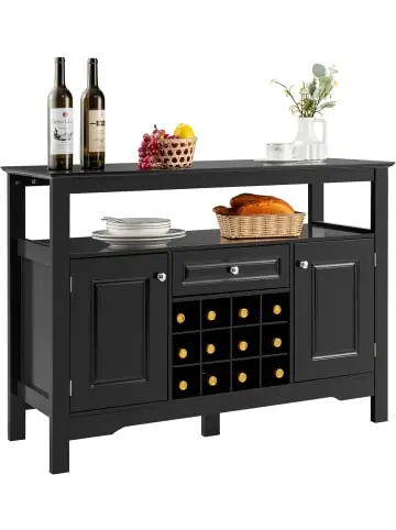 Beschreibung: Dieses Möbelstück ist die perfekte Kombination aus Praktikabilität und Eleganz. So lassen sich Küchenutensilien, Geschirr, Flaschen, etc. ordentlich aufbewahren. Aus hochwertigen MDF-Platten gefertigt ist der Schrank stabil und sehr langlebig. Das Weinregal dient der Lagerung von Flaschen, kann bei Bedarf für mehr Stauraum aber auch abgenommen werden. Durch den eleganten und modernen Stil passt der Schrank wunderbar zu verschiedensten Einrichtungen.Eigenschaften: Mit oberem Regal, offenem Regal, zwei Schränken mit Türen und einer Schublade Weinregal ist abnehmbar für mehr Stauraum bei Bedarf Aus hochwertigem MDF, für den langfristigen Gebrauch geeignet Vier Holzbeine und ein zusätzliches Stützbein erhöhen die Gesamtstabilität Glatte und wasserfeste Oberfläche leicht mit feuchtem Tuch zu reinigen Magnetischer Türverschluss, schließt Tür fest und schützt darin befindliche DingeGlatte Scharniere und Metallknöpfe für leichtes Öffnen und Schließen der Tür Modernes und stilvolles Aussehen passt zu jeder Einrichtung Geeignet für Esszimmer, Wohnzimmer, Küche, Eingangsbereich, etc. Material: MDF, Holzwerkstoffe Gesamtmaße: 117 cm x 40,5 cm x 82,5 cm Nettogewicht: 31,2 kg Tragkraft der oberen Ablage: 40 kg Tragkraft des offenen Regals: 30 kg Tragkraft des Schranks: 10 kg Tragkraft der Schublade: 5 kg Tragkraft des Weinregals: 2 kg pro AbteilLieferungsumfang: 1 x Buffetschrank 1 x Anleitung