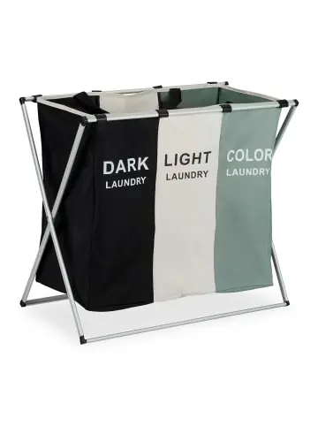 Mit diesem praktischen Wäschesammler mit 3 Fächern bringst Du ganz einfach Ordnung in Deine Wäsche. Dank der separaten Fächer kannst Du Deine Wäsche effizient nach Farben oder Materialien trennen und sparst so Zeit. Anhand der Beschriftung der robusten Wäschekörbe aus Polyester kannst Du leicht ablesen, welche Wäsche in welchem Fach ist. Das Aluminiumgestell sorgt für einen festen Stand. Bei Nichtgebrauch kannst Du den Wäschebehälter einfach zusammenklappen und platzsparend verstauen.Wäschesammler im Detail – Gesamtmaß H x B x T: ca. 60 x 65 x 36,5 cm – Breite je Fach ca. 20 cm – Volumen pro Fach: ca. 35 l – Belastbarkeit pro Fach: ca. 3 kg – Gewicht: ca. 0,6 kg – Material: Polyester, Aluminium, Kunststoff – Farbe: Schwarz, Weiß, Grau, SilberWäschebox zur Schmutzwäschesortierung – 3 separate Fächer zur mühelosen Trennung von Wäschestücken – Großzügiges Fassungsvermögen von ca. 105 Litern – Bei Nichtgebrauch platzsparend zusammenfaltbar – Fächer aus robustem Polyester mit Aluminiumgestell – Feste Fixierung durch praktische Klettverschlüsse – Mit Tragegriffen für einen einfachen Transport – Schneller Aufbau ganz ohne WerkzeugLieferumfang – 1x Wäschekorb in Einzelteilen – Dekoartikel sind nicht im Lieferumfang enthalten