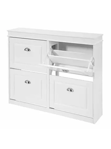 Mit diesem Schuhkipper sagen Sie dem Schuhchaos in Ihrem Flur den Kampf an! Der geschlossene Schuhschrank schützt Ihre Sandalen, High Heels und Turnschuhe gegen Staub, Ausbleichen und sorgen für einen ordentlichen Flur. Dieses Schuhregal kann mit Sicherheitsbeschlägen an der Wand befestigt werden, damit es nicht umkippt. So kann sichergestellt werden, dass es stabil in Ihrem Haus steht. Zur kühlen Eleganz des modernen Wohnstils passt ein geradliniger Schuhkipper in eleganter Farbe. Die Metallgriffe betonen das cleane Design und machen den Schrank einfach und stilvoll.Gewicht: ca.: 27,7kg; Belastbarkeit: bis 50kg; Material: MDF(E1), weiß lackiert.; Produktmaße: BHT ca.: 105x83x24cm.