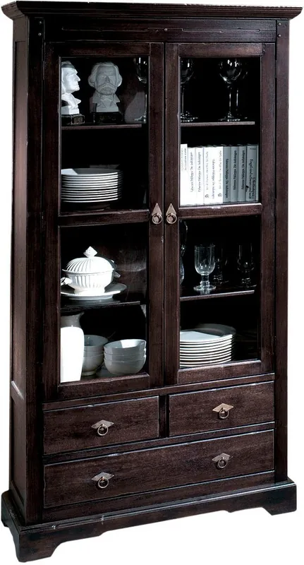 Wohnzimmerschrank mit schönem antikfinish. Türen mit Glaseinsatz. 3 Schubkästen. 2 Türen. Maße (B/T/H): ca. 98/44/183 cm