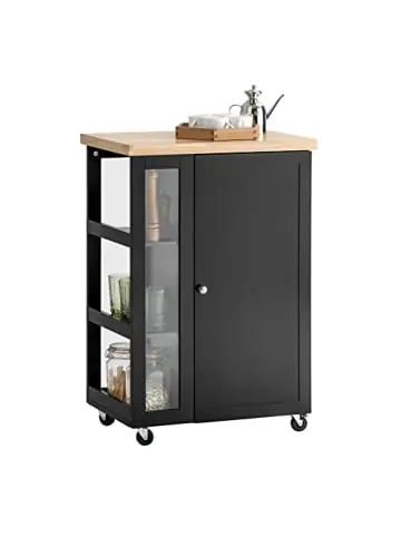 Es verfügt über einen Schrank mit Tür, um Ihre verschiedene Speicherplatzbedarf mit ausreichend Platz zu erfüllen; Die 2 Zwischenböden sind frei justierbar. Dank der 3 offenen Ablagen rechts können Sie Getränke, Tassen und alles, was schnell zur Hand sein soll, abstellen. Der Küchenwagen hat vier stabile Gummirollen (2 davon feststellbar), auf denen sich der Küchenwagen leicht auf jeder Oberfläche verschieben lässt.Gewicht: ca.25kg; Belastbarkeit: bis 75 kg; Material:MDF(E1), Glas.