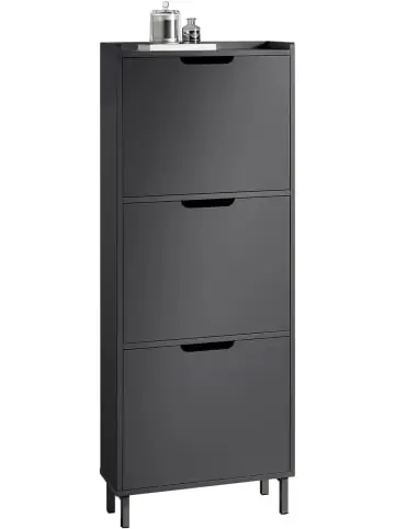 Geeignet für Eingangsbereiche aller Art: nur 19 cm tief. Mit den 3 Klappfächern können Sie ganz frei Schuhen in verschiedenen Größen und Formen aufbewahren. Die stabile Konstruktion gibt dem Schrank einen sicheren Stand, außerdem können Sie ihn mit einem Kippschutz an der Wand befestigen, was die Stabilität extra erhöht.Gewicht: ca.16,65kg; Belastbarkeit: bis 21kg(Obere Platte 6 kg, jede Klappe 5 kg); Material:MDF(E1), Metall.