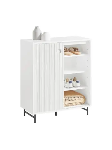Möchten Sie die linke oder rechte Schrankseite offen zeigen? Durch die praktische Schiebetür können Sie Ihre Meinung jederzeit ändern. Mit 2 großen Fächer(3 höhenverstellbare Einlegeboden auf jede Seite) bietet die Kommode ausreichend Platz für Sie. Mit 5 Beinen aus Metall und Bambus steht dieses Sideboard stabiler auf dem Boden. Die meisten Kehrroboter können nach Belieben rein und raus gehen, da die Beine 10 cm hoch sind.Gewicht: ca.26,9kg; Belastbarkeit: bis 60kg; Material:MDF(E1), Metall, Bambus.
