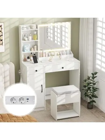Beschreibung: Verbessern Sie Ihre Schönheitsroutine mit diesem LED-Schminktisch-Set. Sie können Ihre Beleuchtung mit 3 Farbmodi und einstellbarer Helligkeit anpassen. Der Frisiertisch bietet mehrere Stauraumoptionen, einschließlich offener Fächer, Regale und Schubladen. Zusätzlich bietet der Stauraumhocker zusätzlichen verborgenen Stauraum. Die praktische Ladestation erleichtert das Aufladen von Telefonen, Tablets und anderen Geräten in Reichweite. Dieses minimalistische Design ergänzt jede Dekoration und ist ein ideales Geschenk für Ihre Lieben.Eigenschaften: Verfügt über einen beleuchteten Spiegel mit einstellbarer Farbe und Helligkeit Viel Stauraum umfasst offene Fächer, Regale, Schubladen und einen Schrank Mit einem 3-stufig verstellbaren Regal für Gegenstände unterschiedlicher Größen Entwickelt mit einem Fönhalter und einer Ladestation Inklusive passendem Hocker mit verstecktem Stauraum Mit sanft gleitenden Schubladenführungen und sanft schließende Scharniere Montage erforderlich Material: Holzwerkstoff + MDF + Glas Tischmaße: 90 cm x 40 cm x 135 cm (L x B x H) Hockermaße: 40 cm x 24 cm x 46 cm (L x B x H) Tischplattenhöhe: 68 cm Spiegelmaße: 60 cm x 50 cm Tragfähigkeit der Tischplatte: 55 kg Tragfähigkeit des Hockers: 100 kg Wechselstromsteckdose: 220–240 V/10 A USB-Anschluss: 5 V/3 A Typ-C-Anschluss: 5 V/3 A Länge des Netzkabels: 1,5 m Gewicht: 24 kgLieferungsumfang: 1 x Schminktisch 1 x Hocker 1 x AnleitungAchtung! Die Lieferung umfasst 2 Pakete, die nicht notwendigerweise mit demselben Spediteur verschickt werden und nicht unbedingt zur gleichen Zeit ankommen.