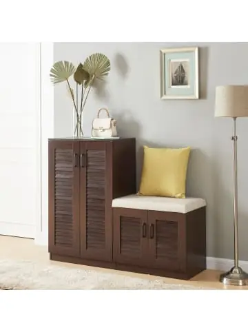 Schuhschrank Der praktische Schuhschrank bietet die ideale Lösung für die Aufbewahrung Ihrer Schuhe und ist eine funktionale und stilvolle Ergänzung für jeden Wohnraum. Der Schuhschrank verfügt über insgesamt neun Ablagen im Inneren, die ausreichend Platz für eine Vielzahl von Schuhen bieten. Egal ob Sneakers, High Heels oder Sandalen – mit diesem Schrank können Sie Ihre Schuhe ordentlich und übersichtlich sortieren. Die vier luftdurchlässigen Türen sorgen für eine optimale Belüftung im Schrankinnern. Dadurch wird eine gute Luftzirkulation gewährleistet, die dazu beiträgt, unangenehme Gerüche zu reduzieren und die Schuhe frisch zu halten. Mit seinem zeitlosen Design fügt sich der Schuhschrank harmonisch in verschiedene Einrichtungsstile ein. Ob im Flur, Schlafzimmer oder Ankleideraum – dieser Schuhschrank ist nicht nur funktional, sondern auch ein attraktiver Blickfang. Der Schrank bietet nicht nur einen großzügigen Stauraum für Ihre Schuhkollektion, sondern verfügt auch über eine integrierte Sitzbank, die das bequeme An- und Ausziehen Ihrer Schuhe ermöglicht. Produkt-Highlights: – Stilvoller Schuhschrank mit vier luftdurchlässigen Türen – Insgesamt neun Ablageflächen im Schrankinnern – Bietet Platz für bis zu 18 Paar Schuhe- Schneller und einfacher Aufbau – Mit einer gepolsterten Sitzbank Material: – Korpus: MDF – Sitzfläche: Schaumstoff – Sitzbezug: Textil (100% Polyester) Maße: – Gesamt (HxBxT): 97 x 120 x 36 cm- Abgeschrägte Ablagen (BxT): je 57 x 36 cm- Gerade Ablagen (BxT): je 57 x 34 cm – Sitzfläche (BxT): 60 x 36 cm – Sitzhöhe: 53 cm Farbe: Wenge Lieferumfang: 1 x Schuhschrank mit integrierter Sitzbank Markenware aus dem Hause: [en.casa]