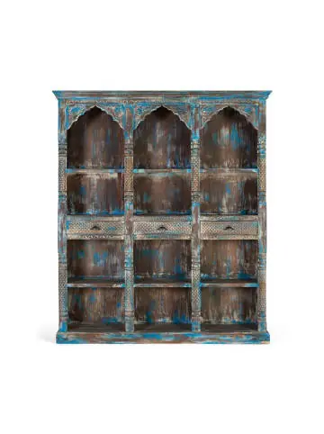 Dieses Bücherregal im exotischen Stil ist ein atemberaubendes Möbelstück, sorgfältig von Hand geschnitzt und in einer bezaubernden antiken blauen Farbe bemalt. Das mit sorgfältiger Handwerkskunst bearbeitete Holz weist komplizierte Muster und Details auf, die ein für exotische Designs typisches Gefühl von Abenteuer und Mystik hervorrufen. Die antike blaue Oberfläche verleiht dem Bücherregal Tiefe und visuelle Geschichte und verleiht ihm einen antiken Look und voller Charakter. Dieses Finish hebt die detaillierten Schnitzereien hervor und macht jedes Design noch markanter und auffälliger. Zusätzlich zu den 3 Schubladen bietet das Bücherregal geräumige Ablagen, ideal zum Präsentieren von Büchern, Dekorationsgegenständen und besonderen Andenken. – Maße der Schubladenfronten: 10x45cm. – Innenmaße der Schubladen: 8x42x26cm. – Höhe der Regale: 34 cm. – Maße der Löcher: 34x45cm Wood