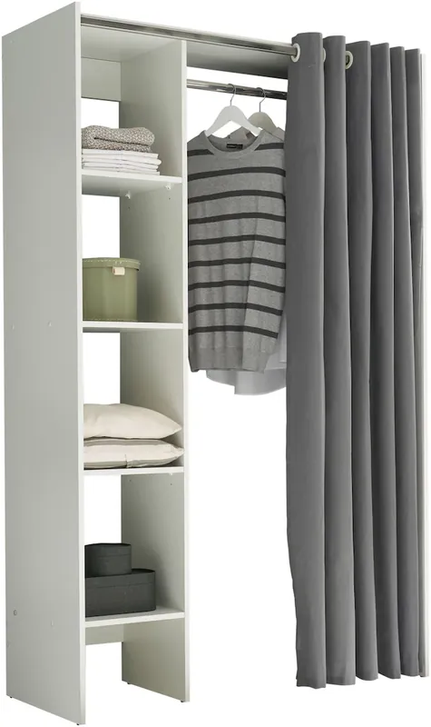 Dieser offene Kleiderschrank bietet mit 4 Einlegeböden, keiner Rückwand und einer ausziehbaren Kleiderstange auf der rechten Seite vielseitige Aufbewahrungsmöglichkeiten.. Die Aufteilung ermöglicht einfachen Zugriff auf Ihre Garderobe, während der Vorhang mit ausziehbarer Stange eine stilvolle Möglichkeit bietet, den Inhalt elegant zu verbergen.. Mit der ausziehbaren Kleiderstange des Kleiderschranks haben Sie die Möglichkeit, Ihre Kleidungsstücke ordentlich aufzuhängen, ohne dass eine Tür im Weg ist.. Die 4 Einlegeböden bieten ausreichend Platz für gefaltete Kleidung, Schuhe oder Accessoires und ermöglichen eine übersichtliche Organisation Ihrer Garderobe.. Dieser offene Kleiderschrank kombiniert Funktionalität mit modernen Design und bietet eine praktische Lösung für die Aufbewahrung Ihrer Kleidung.