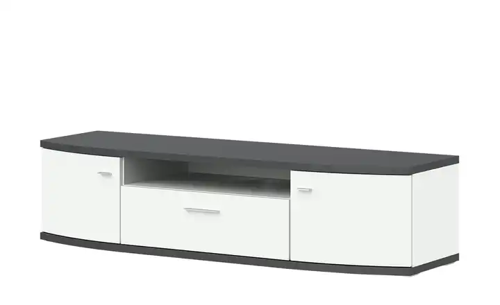 Auf dem TV-Lowboard Gabbro können Sie mittig Ihren Fernseher platzieren. Direkt darunter befindet sich ein offenes Fach für DVD-Player oder Festplattenrecorder. Stauraum steht Ihnen hinter den beiden Türen und in dem mittigen Schubfach zur Verfügung. Gabbro hat einen strahlenden Weißton. Die Ober- und Unterplatte sind farblich abgesetzt und rahmen das Weiß ein.