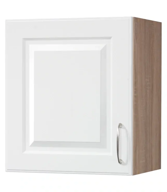 Hängeschrank mit einer Tür. Türanschlag wechselbar. Pflegeleichte MDF Front mit Kassettenfräsung. Made in Germany. Metallgriff
