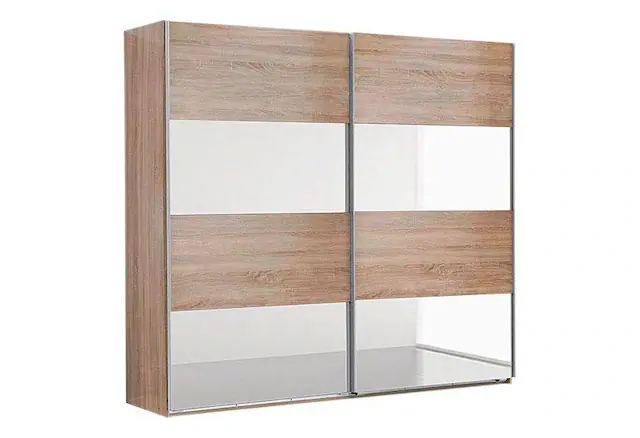 Der Wimex Schwebetürenschrank mit vielen Kombinationsmöglichkeiten ist individuell gestaltbar. Die Front des Kleiderschranks besteht aus mehrfach unterteilten Dekor- und Spiegelelementen, die beliebig montiert werden können. Es kann aus verschiedenen Breiten und Farben ausgewählt werden. Im Inneren präsentiert sich ein graues Leinendekor, das in Kombination mit der Außenoptik das Gesamtbild gekonnt abrundet.
