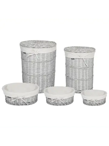 Weidenholz-Körbe-Set. Verleihe deinem Zuhause einen Hauch von natürlicher Eleganz mit diesem handgefertigten Set aus 5 Weidenkörben. Die Kollektion besteht aus zwei geräumigen, runden Wäschekörben mit Deckel und drei kleineren Aufbewahrungskörben, die sowohl schön als auch praktisch sind. Die Körbe sind mit einem abnehmbaren, waschbaren Stoff ausgekleidet, der die Pflege erleichtert und für Ordnung sorgt. Diese langlebigen und stilvollen Körbe passen perfekt in jeden Raum und bieten eine vielseitige Aufbewahrungslösung mit rustikalem Charme.Details: Typ: Wäschekörbe Farbe: Weiß Material: Weidenholz Zusätzliches Material: Stoff Zusammenstellung: 73% Polyester Form: Rund Finish: Gefärbt Handgefertigt: Ja Volumen: 55/89Dimensions: Tiefe: 45/38/28/23/18 cm Breite: 45/38/38/33/28 cm Höhe: 56/49/15/13/11 cm Gesamtmasse: 45x45x56 Gewicht: 3.5 kgSie kaufen: 5 x KorbProduktvorteile: Erzeugt Wohlfühlcharakter in jedem Raum, Dekorativ und zugleich funktional, Handgefertigte Präzision, Hochwertiges Material, Vielseitige Nutzungsmöglichkeiten, Grosszügiger StauraumMontage: Benötigt keine MontageZusatzinformationen: Bitte beachten Sie, dass jedes Produkt handgefertigt ist. Abweichungen in Struktur, Farbe oder Form können aufgrund der Eigenschaften der verwendeten Materialien auftreten und stellen keinen Qualitätsmangel dar. Da bei der Herstellung natürliche Materialien verwendet werden, können kleine Farb-, Form-, bzw. Größendifferenzen auftreten. Diese Unterschiede stellen jedoch keinen Produktfehler dar.Pflegeanleitung:Weidenholz: 1.Bitte ausschließlich milde Reinigungsmittel und weiche Tüchern verwenden. Dabei immer in Richtung der Maserung abwischen 2.Sofort nach der Reinigung abtrocknen, um zu verhindern, dass sich Wasser auf dem Produkt absetzt 3.Nur bei geölten Holzartikeln befolgen: Sie sollten nach einiger Zeit nachgeölt werden, damit sie lange in einem guten Zustand erhalten bleiben.Stoff: 1.Von Hand oder mit einem Feinwäsche-Programm bei max. 30°C waschen, wenn auf dem Etikett keine weiteren Hinweise des Herstellers gegeben sind 2.Wenn auf dem Etikett nicht anders angegeben, bitte nicht im Trockner trocknen und auch nicht bügeln.
