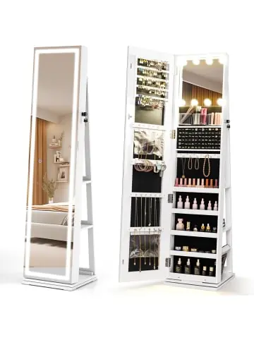 Beschreibung: Verwandeln Sie Ihr Zimmer in einen Ankleidebereich mit unserem drehbaren Schmuckschrank!Der freistehende Schmuckorganizer ist ausgestattet mit einem Ganzkörperspiegel, einem Schmuckschrank und hinteren Ablagen für Ihren Gebrauch. Das 360° drehbare Design macht es bequem, Ihren Schmuck zu erreichen, ohne sich bewegen zu müssen. Der Ganzkörperspiegel und der innere Schminkspiegel verfügen über LED-Lichter, die Ihnen eine klare Sicht auf Ihr Gesicht ermöglichen. Mit rutschfesten Füßen steht der Schmuckschrank stabil am Boden. Zudem ist der Organizer mit einer abschließbaren Tür und 2 Schlüsseln, Ausschnittgriff, weichem Innenfutter und Magnetschließung ausgestattet.Eigenschaften: Ganzkörperspiegel mit LED-Beleuchtung reflektiert Ihr Bild von Kopf bis Fuß Offene Ablagefächer für leichten Zugriff Hintere Ablagen zur Aufbewahrung von Büchern oder Dekoration Großzügiger Stauraum für Schmuck und Kosmetik 360° drehbarer Sockel für einfache Rotation Schminkspiegel mit 3 Lichtmodi verbessert Ihren Make-up-Prozess Magnetschließer und Schloss für sicheren Verschluss USB-Kabel inklusive für bequeme Nutzung Weiches Innenfutter schützt den Schmuck Material: MDF + Aluminiumspiegel Produktgröße: 43 x 38 x 160 cm (L x B x H) Maße des Ganzkörperspiegels: 157 x 36,5 cm (L x B) Maße des eingebauten Spiegels: 33,5 x 33,5 cm (L x B) Nettogewicht: 22 kgLieferungsumfang: 1 x Schmuckschrank 1 x Benutzerhandbuch