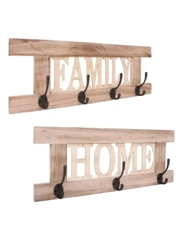 – Markeninhaber TÜV-Süd QM zertifiziert mit Nr. 12 100 59626 TMS für Qualitäts-Management in Deutschland – 2x Wandgarderobe mit 3 und 4 Doppelhaken – Mit dreidimensionalem Schriftzug – BSCI-Sozialstandards geprüft – Mit Aufhängevorrichtung – Kombinierbar mit unserer Shabby-Serie C60- Mit diesen Garderoben können Sie jede Wand dekorativ aufwerten! Durch den Shabby-Look wirkt jeder Flur, oder das Schlafzimmer viel wohnlicher. Die praktischen Haken machen es möglich, Ihre Kleidung schnell greifbar und übersichtlich unterzubringen.- Die gebürstete Oberfläche verleiht diesen Garderobenpaneels einen ganz eigenen, individuellen Used-Look, der einerseits rustikal, andererseits aber auch spielerisch leicht wirkt. Somit fügen sich diese Wandgarderoben nahtlos in jede Umgebung ein. Maße Schild Home (HxBxT) (ca.):Gesamt: 21x55x7 cmTiefe (ohne Kleiderhaken): 2 cm Maße Schild Family (HxBxT) (ca.):Gesamt: 21x60x7 cmTiefe (ohne Kleiderhaken): 2 cm Material:Paneel: PaulowniaholzHaken: Metall Lassen Sie sich von der lädiert anmutenden Oberfläche nicht täuschen, die Produkte dieser Serie sind qualitativ hochwertig verarbeitet und wurden nur aus den besten Materialien gefertigt. Die Holzelemente wurden aus der Paulownie hergestellt, einem auch schon in Europa kultivierten Wertholzbaum, der aufgrund seiner Leichtigkeit und hohen Stabilität auch als das Aluminium der Hölzer bezeichnet wird. Diese hübschen Wandgarderoben sind mit vielen weiteren Artikeln unserer Shabby-Serie C60 kombinierbar. Der Hersteller ist erfolgreich BSCI-geprüft. Dabei wird der Hersteller verpflichtet, sich an soziale Standards zu halten. Noten von A (sehr gut) – E (ungenügend) Soziales Managementsystem (Note D), Arbeitnehmerschutz (A), Recht auf Kollektivverhandlungen/Vereinigungsfreiheit (A), Keine Diskriminierung (A), Angemessene Vergütung (B), Angemessene Arbeitszeit (D), Arbeitssicherheit und Gesundheitsschutz (B), Keine Kinderarbeit (A), Arbeitsschutz für Jugendliche (A), Keine Scheinbeschäftigung (A), Zwangsarbeit (A), Umweltschutz (A), Ethisches Geschäftsverhalten (A) Auditor: Amfori, DBID: 351271, Audit Id: 165443 WICHTIG – bitte beachten: Versand erfolgt gleichzeitig in mehreren Paketen. Dennoch können wir nicht garantieren, dass diese zur selben Zeit ankommen. Ggfs. ist es notwendig die Pakete mit 2 unterschiedlichen Logistikern zu versenden.Versandzustand: Teilmontiert–Sicherheitshinweise für Teilartikel mit Artikelnummer 61508 Dieser Artikel ist eine Wandgarderobe und sollte nur als solche verwendet werden. Der Artikel ist nur für den Innenbereich geeignet. Überladen Sie den Artikel nicht. Vorsicht: Verletzungsgefahr! Beim Bohren in Wand oder Decke auf Kabel, Rohre sowie Gas- und Wasser-leitungen achten!Vorsicht Erstickungsgefahr! Verpackungsmaterial, wie Plastikbeutel, gehören nicht in Kinderhände. Bitte von Babys und Kleinkindern fernhalten! Nicht über den Kopf ziehen! Vorsicht: Verschluckungsgefahr! Achtung dieser Artikel kann verschluckbare Kleinteile enthalten! Halten Sie die Kleinteile von Kindern fern! Prüfen Sie den Artikel regelmäßig alle 3-6 Monate auf Beschädigungen und gelöste Verbindungen. Ziehen Sie lose Schrauben wieder fest an! Sollten Beschädigungen entdeckt werden, darf der Artikel nicht mehr genutzt werden! Benutzen Sie diesen Artikel nur für die bestimmungsgemäße Verwendung, im technisch einwandfreien Zustand und für private Zwecke. Andere Verwendungen gelten als nicht bestimmungsgemäß und können zu schweren Verletzungen und Beschädigungen führen. Für aus bestimmungswidriger Verwendung entstandene Schäden übernimmt der Hersteller keine Haftung.Allgemeine Hinweise: Bitte lesen Sie alle Hinweise sorgfältig durch, bevor Sie den Artikel aufbauen und verwenden. Verwahren Sie die alle Sicherheitsinformationen und Aufbauanleitungen gut auf. Für Ihre eigene Sicherheit und die Ihres Produktes, befolgen Sie bitte die Sicherheitshinweise. Eine falsche Handhabung könnte zu ernsten Verletzungen, beschädigtem Eigentum oder sogar dem Tod hinauslaufen.Pflegehinweise: Saugen Polstermöbel regelmäßig ab. Hat der Artikel einen Bezug pflegen und reinigen Sie diesen entsprechend nach Material (Textil, Leder, Kunstleder). Besteht ihr Möbel aus Holz nutzen Sie einen Staubwedel zur Reinigung. Für alle anderen Oberflächen und bei stärkerem Schmutz können Sie ein nebelfeuchtes Baumwolltuch verwenden. Keinesfalls sollten Sie scharfe oder scheuernde Reiniger verwenden, diese können Schäden verursachen. Für Möbel im Bad: Wasser und Kondenswasser sofort abwischen! Entsorgungshinweise: Entsorgen Sie den Artikel umweltgerecht. Überlegen Sie Alternativen zu Entsorgung wie Spenden oder Verkaufen. Elektrische Artikel gehören nicht in den Hausmüll. Entsorgen Sie diese an einem Recyclinghof für elektrische und elektronische Altgeräte, weitere Informationen erhalten Sie bei Ihrer örtlichen Gemeindeverwaltung. Einlagerungshinweise: Der Artikel sollte trocken und sauber sein, verwahren Sie diesen geschützt in dem Karton in dem er geliefert wurde.