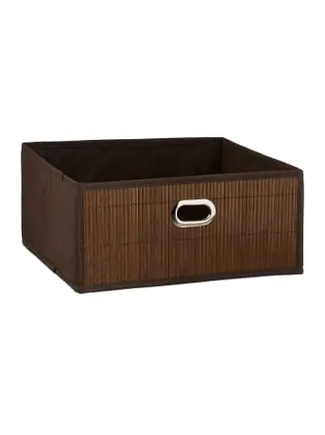 Ob für Unterwäsche im Kleiderschrank oder Accessoires in der Garderobe, im Regalkorb sind Ihre Utensilien ordentlich verstaut. Dank natürlichem Bambus-Dekor ist die Aufbewahrungsbox auch im Badezimmer gut aufgehoben. Hier dient sie zur Aufbewahrung von Badutensilien oder als Handtuchkorb. Platzieren Sie den quadratischen Bambuskorb im Schrank oder Regal, wo er mit dem Eingriff einfach herausgezogen werden kann. Bei Nichtgebrauch ist das Badkörbchen im Nu zusammengefaltet verstaubar.Aufbewahrungskorb im Detail – Maße H x B x T: ca. 14 x 31 x 31 cm – Innenmaße H x B x T: ca. 13,5 x 30 x 30 cm – Stauraum: ca. 12 l – Traglast: ca. 3 kg – Gewicht: ca. 350 g – Material: Vlies, Karton, Bambus – Verschiedene Farben zur WahlFaltbare Ordnungsbox aus Bambus – Praktisch für Bad, Wohn-, Kinderzimmer uvm. – Für Kleinteile wie Spielzeug, Badutensilien etc. verwendbar – Dekoratives Bambus-Dekor auf der Vorderseite – Ideal für Schrank oder Regal – Mit Eingriff zum Herausziehen – Bei Nichtgebrauch platzsparend zusammenfaltenLieferumfang – 1x Badezimmerkorb (Farbwahl) – Dekoartikel sind nicht im Lieferumfang enthalten