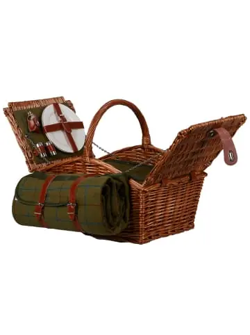 Picknickkorb für 2 Personen mit Picknickdecke, Besteck und GeschirrMit diesem Picknick Set haben Sie alles dabei, was Sie für das nächste Picknick mit zwei Personen benötigen, egal ob im Park, am See, beim Campingausflug oder im eigenen Garten. Der Picknickkorb beinhaltet eine Picknickdecke, Teller, Besteck, Multifunktionsmesser, Gläser sowie Salz- und Pfefferstreuer. Der Korb kann mit dem Henkel bequem getragen werden. Die Bestandteile werden dabei von Riemen gehalten und bleiben auch beim Transport an ihren festen Plätzen. Sie müssen nur das Essen und die Getränke einpacken und schon steht dem Picknickausflug nichts mehr im Wege. Der Picknickkorb besteht aus geflochtener Weide. Die Porzellanteller und das rostfreie Besteck aus Edelstahl werden von Riemen aus Kunstleder gehalten. Die Abmessungen des Weidenkorbs betragen ca. 28/40x32x48 cm (HxBxL) und die Picknickdecke ist ca. 135×115 cm groß. Bestandteile:1x Korb mit integrierter Kühltasche 1x Picknickdecke 2x Teller aus Porzellan2x Messer aus Edelstahl 2x Gabel aus Edelstahl 2x Teelöffel aus Edelstahl 2x Weingläser aus Glas 1x Taschenmesser 1x Salz- und Pfefferstreuer 1x Korkverschluss Details:Abmessungen Korb: ca. 28/40x32x48 cm (HxBxL) Abmessungen Picknickdecke: ca. 135×115 cm (LxB) Farbe: Natur/Dunkelgrün