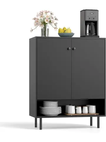 Beschreibung: Vielseitig und stilvoll – dieser Küchen-Buffetschrank ist ein wahres Stauraumwunder mit Arbeitsplatte, Schrank und Fach. Er hält wichtige Dinge stets griffbereit und sorgt für Ordnung. Ob Dekoration, Geschirr, Küchenutensilien, Lebensmittel oder Getränke – hier findet alles seinen Platz. Die stabile Konstruktion trägt bis zu 110 kg und wird durch zwei Kippschutz-Kits und Metallbeine zusätzlich gesichert. Das 5-fach verstellbare Regal lässt sich flexibel an unterschiedliche Gegenstände anpassen. Das moderne, schlichte Design mit abgedeckten Schraubenlöchern verleiht jedem Raum zusätzlichen Charme. Weitere benutzerfreundliche Details warten auf Sie.Eigenschaften: Breite Arbeitsplatte, geschlossener Schrank und offenes Fach Innenregal verstellbar oder herausnehmbar für unterschiedlich hohe Gegenstände 2 Kippschutz-Kits zur sicheren Wandbefestigung Metallstützbeine zur strukturellen Verstärkung 2-Türen-Design für bequemen Zugriff Praktische Griffe zum einfachen Öffnen der Türen Verstellbare Metallscharniere für präzise Türausrichtung Verbindungselemente mit Schrauben für zusätzliche Stabilität Abdeckungen für Schraubenlöcher für ein elegantes Gesamtbild 12 cm Bodenfreiheit für einfaches Reinigen Hinweis: Der Buffetschrank erfordert Montage Material: MDF, Holzwerkstoff Gesamtmaße: 75 x 35 x 95 cm (L x B x H) Maße des verstellbaren Regals: 72,5 x 32,5 cm (L x B) Innenmaße des Schranks: 72,5 x 32,5 x 56 cm (L x B x H) Höhe vom Boden: 12 cm Verstellabstand pro Regalposition: 3,2 cm Belastbarkeit der Arbeitsplatte: 50 kg Belastbarkeit pro Regal: 20 kg Nettogewicht: 19,5 kgLieferungsumfang: 1 x Buffetschrank 1 x AnleitungWarnhinweise Achtung: Befestigen Sie den Schrank sicher an der Wand, um das Kippen zu vermeiden.