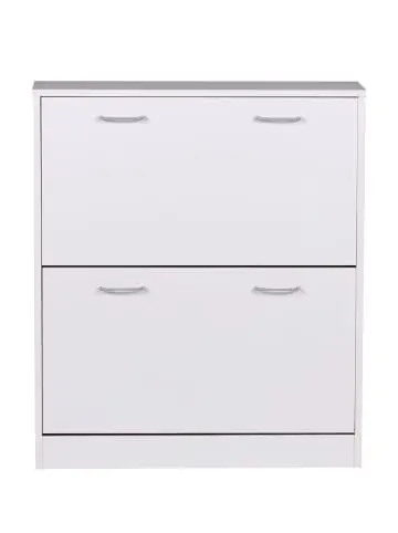 DesignSchuhablage im modernen und zeitlosen DesignPraktisches Schuhregal mit klaren LinienSchrank mit zwei geräumigen Fächern hinter den KlappenJe Klappe zwei farblich abgesetzte und formschöne GriffeDie Rückwand des Kippers ist in braun gehaltenZusätzlich eine geräumige Ablagefläche für z.B. SchlüsselFarbeKorpus: Weiss mattRückwand: BraunGriffe: GrauAbmessungenBreite: ca. 75 cmHöhe: ca. 87 cmTiefe: ca. 24 cmSockel: ca. 8 cmEinzelfächer innen je ca. 70 x 34 cmFachhöhe ca. 10-14 cm je nach EinstellungBesonderheitenDie Schuhkommode bietet Platz in engen und nicht geräumigen DielenInsgesamt können bis zu vier Schuhfächer genutzt werdenJedes Schuhfach ist in der Höhe in drei verschiedenen Positionen einstellbarDie Rückwand ist geschlossen – dadurch ist Ihre Wand vor Schmutz geschütztGeeignet für ca. 20 Paar Schuhe (Je nach Schuhgröße – Angabe basiert auf Schuhgröße 36)Bitte beachten Sie, dass bei größeren Herrenschuhen, welche am Fußgelenk nach oben gehen, der Mittelboden des Kippers ausgelassen werden sollteMaterialKorpus, Ablage und Klappen: Spanplatte Klappenauszüge & Griffe: KunststoffLieferumfang1 SchuhschrankOhne DekorationMontageLieferzustand: praktisch zerlegt und praktisch verpacktLeicht verständliche Montageanleitung inklusiveEinfacher und schneller Aufbau dank gut durchdachter Konstruktion