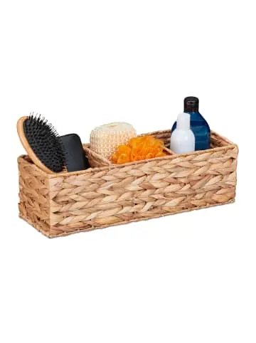 Mit dem geflochtenen Aufbewahrungskorb aus Wasserhyazinthe holst Du Dir einen praktischen und zugleich dekorativen Ordnungshelfer nach Hause. Ob als Badezimmerkorb für Kosmetik, Bürsten und weitere Badartikel oder für Kleinutensilien in Schlaf- und Wohnzimmer – im Flechtkorb mit 3 Fächern lassen sich alle Kleinigkeiten des Alltags übersichtlich verstauen. Dabei überzeugt das Körbchen aus natürlicher Wasserhyazinthe mit seinem dekorativen, geflochtenen Design.Aufbewahrungskorb Wasserhyazinthe im Detail – Maße Korb H x B x T: ca. 13 x 42,5 x 15 cm – Innenmaße je Fach H x B x T: ca. 12 x 13 x 13 cm – Gewicht: ca. 0,6 kg – Material: Wasserhyazinthe, Eisen – Farbe: NaturVielseitiges Flechtkörbchen für mehr Ordnung – Dekokörbchen für Wohn-, Schlaf- und Badezimmer – Ideal für Kosmetikartikel und Bürsten im Bad – Auch zum Verstauen von Accessoires, Spielzeug uvm. – 3 Trennfächer sorgen für mehr Übersichtlichkeit – Flechtoptik setzt dekorative Akzente in jedem Raum – Formstabile Konstruktion mit MetallrahmenLieferumfang – 1x Badkorb – Dekoartikel sind nicht im Lieferumfang enthalten