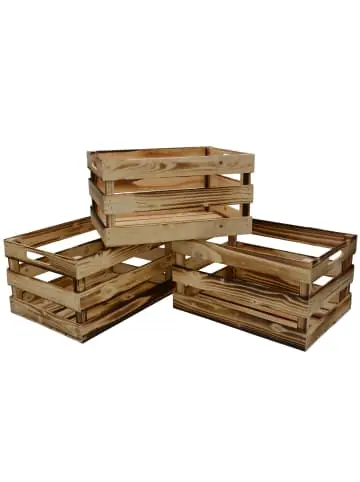 Holzkiste Vintage 3er Set 39x29x21 cm geflammtDas stilvolle Design der Holzkisten bringt Vintage Flair in Ihr Zuhause und verschönert jeden Raum. Die Holzkisten sind vielseitig einsetzbar, egal ob als Dekoration, zur Aufbewahrung, zum Transportieren oder als kleines Möbelstück. Dekorieren Sie die Holzkiste mit weiteren Dekoelementen oder verwandeln Sie diese in ein praktisches Regal oder einen Beistelltisch. Sie sind auf der Suche nach einer kreativen Geschenkidee? Diese Weinkisten eignen sich nicht nur als Geschenk selbst, sondern auch als Geschenkkiste in dem Sie Kleinigkeiten schön präsentieren können. Überraschen Sie damit Ihre Freunde, Familie und Bekannte!ProduktdetailsMaterial: – Holz Details: – 3er Set Holzkisten Verwendung: – Dekokiste oder Aufbewahrungskiste Abmessungen: – Maße: 39 x 29 x 21 cm (LxBxH)