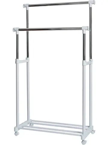 – Material: Metall, Kunststoff – 2 Kleiderstangen – höhen- und breitenverstellbar dank Teleskopstangen – 1 Abstellfläche für bis zu je 3 Paar Schuhe – 4 praktische RollenHinweis: Dekoration ist nicht im Lieferumfang enthalten.