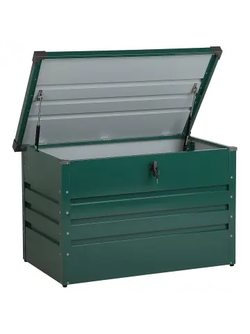 Wetterfeste Gartenkissenbox aus Metall in Dunkelgrün. In dieser hochwertigen, robusten verzinkten Stahltruhe finden Sie genügend Platz für all Ihre Garten-, Sport- oder Campingutensilien und schützen sie über das ganze Jahr vor jeglichen Wettereinflüssen. Der stabile, glatte Deckel lässt sich mit Hilfe des Drehgriff-Zylinderschlosses verschliessen und dank einer Gasdruckfeder leicht öffnen.Details: Typ: Truhe Farbe: Grün Farbton: Dunkelgrün Material: Stahl Finish: Galvanisiert Volumen: 300Dimensions: Tiefe: 62 cm Breite: 100 cm Höhe: 64 cm Gewicht: 20 kg Max. Belastung: 30 kgSie kaufen: 1 x KissenboxProduktvorteile: Klassisches Design, Stabile und solide Konstruktion, UV-Beständigkeit, Wasserdicht dank hochwertiger Materialien, Abschliessbar zur sicheren Aufbewahrung, Praktischer, großer StauraumMontage: Nicht montiert. 120-180 Min.Beständigkeit: Windbeständig, Schmutzbeständig, UV-beständig, RostbeständigBeständigkeit Text: UV-strahlenbeständige Möbel weisen eine erhöhte Beständigkeit gegen Verblassen oder Verfärbung auf. Wir empfehlen jedoch, dass Sie das Produkt bei Nichtgebrauch abgedeckt aufbewahren. Dies gewährleistet die maximale Lebensdauer der Möbel. Das Produkt wurde aus Materialien gefertigt, die eine hohe Fleckenbeständigkeit aufweisen, weshalb es zu keinen Verfärbungen kommen sollte oder diese leicht zu beseitigen sind. Bei der Fleckenentfernung sind die Pflegehinweise zu berücksichtigen. Dank eines entsprechenden Finish zeichnet sich das Produkt Oberfläche durch eine Rostbeständigkeit aus. Dies bedeutet, dass es im Freien genutzt werden kann. Werden die Möbel nicht genutzt, sollte entweder eine Abdeckung verwendet oder sie sollten an einem trockenen Ort gelagert werden. Dieses Produkt besitzt eine hohe Windbeständigkeit, weshalb es nicht umkippen oder seine Stabilität aufgrund von Windböen verlieren sollte.Pflegeanleitung:Stahl: 1.Mit milder Seife und Wasser reinigen. Keine säurehaltigen oder scheuernden Reiniger verwenden, da diese die Oberfläche beschädigen können 2.Auf Korrosion prüfen, insbesondere an beschädigten oder abgenutzten Stellen, und freiliegendes Metall zum Schutz mit zinkhaltiger Farbe behandeln 3.Zur Korrosionsvorbeugung Rinnen und Verbindungen sauber halten, stehendes Wasser vermeiden und bei feuchten Bedingungen verzinkten Stahl mit Kupfer oder Messing durch Kunststoff- oder Gummielemente isolieren 4.Bei Stahlteilen mit beweglichen Komponenten einen leichten Schmierstoff auftragen, um reibungslose Funktion und Rostschutz zu gewährleisten.