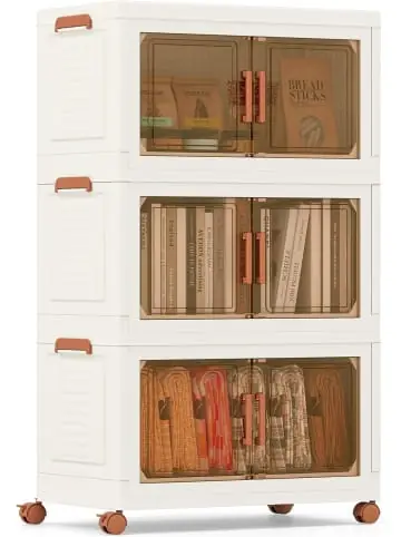 Beschreibung: Maximieren Sie Ihren Stauraum mit diesen praktischen 3er-Pack Aufbewahrungsboxen! Egal ob saisonale Kleidung, Küchengeräte oder Bücher – die Aufbewahrungsboxen bieten eine ideale Lösung. Sie können die Boxen einfach zusammenfalten und platzsparend lagern oder stapeln, um Ihren Raum effizient zu nutzen. Die Fronttür mit Magnetverschluss ermöglicht einen einfachen Zugriff auf die aufbewahrten Gegenstände. Für zusätzlichen Komfort verfügen die Behälter über leicht zu greifende Griffe. Die 4 Universalräder (2 mit Bremsen) ermöglichen mühelose Bewegung im gesamten Haus. Diese vielseitigen Boxen eignen sich ideal als Kleiderorganisator, Schuhschrank, Snack-Aufbewahrung oder Werkzeugschrank.Eigenschaften: Große Aufbewahrungsboxen halten Ihr Zimmer ordentlich und frei von Unordnung Durchsichtige Türen ermöglichen einfachen Zugang zu Ihren Dingen Magnetverschluss hält die Türen des Schranks geschlossen Praktische Griffe erleichtern das Öffnen und Schließen der Türen Sicherheitsverschluss verhindert das Herunterfallen der Aufbewahrungsboxen Ausgestattet mit 4 Universalrädern (2 mit Bremsen) für freie Mobilität Das stapelbare Design nutzt den vertikalen Raum in Ihrem Zuhause optimal Anwendbar für Wohnzimmer, Schlafzimmer, Küche oder Kleiderschrank Material: PP, ABS Gesamtmaße: 62,5 x 34,5 x 99,5 cm (B x T x H) Einzelgröße: 62,5 x 34,5 x 33 cm (B x T x H) Zusammengeklappte Größe: 61,5 x 33,5 x 23 cm (B x T x H) Nettogewicht: 6 kg Gewichtskapazität jedes Regals: 10 kgLieferungsumfang: 1 x Aufbewahrungsbox mit Deckel 1 x Anleitung