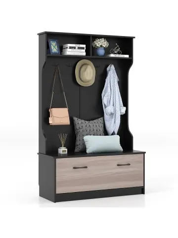 Beschreibung: Diese Garderobe ist eine tolle Aufbewahrungsmöglichkeit für Ihren Eingangsbereich, Flur oder Schlafzimmer. Sie verfügt über großzügigen Stauraum, darunter 5 Doppelhaken, 2 offene Regale und 1 geschlossenen Schrank mit 2 pneumatischen Stangen. Sie können darin Ihre Taschen, Hüte, Kleidung, Schmuck und andere Dinge aufbewahren. In der Zwischenzeit gibt es eine Sitzbank, auf der Sie bequem die Schuhe wechseln können. Die Bank trägt ein Gewicht von bis zu 90 kg. Ihr solider Rahmen und die rutschfesten Fußpolster sorgen für allgemeine Stabilität. Und der zusätzliche Kippschutz sorgt für eine sichere Befestigung an der Wand und sorgt so für mehr Stabilität und Sicherheit. Sie müssen sich keine Sorgen machen, dass es plötzlich zusammenbricht.Eigenschaften: 2 offene Fächer und 1 Türschrank mit 2 Fächern zur Aufbewahrung Doppelzinkenhaken und große Ablagefläche für verschiedene Anwendungen Pneumatische Stangen und Magnetverschlüsse zum einfachen Öffnen oder Schließen Kippschutz für zusätzliche Stabilität und Sicherheit Sicheres und stabiles Design Hochwertiger Holzwerkstoff für den Langzeitgebrauch Ideal für Flur, Schlafzimmer usw. Einfache Montage mit übersichtlicher Bedienungsanleitung und komplettem Zubehör Farbe: Weiß Material: Holzwerkstoff Gesamtmaße: 100 x 40 x 160 cm (L x B x H) Höhe des oberen Fachs: 20 cm Höhe des Türschranks: 43 cm Abstand zwischen oberem Fach und Sitzbank: 95 cm Breite der Basis: 39 cm Tragfähigkeit der Bank: 90 kg Nettogewicht: 32,5 kgLieferungsumfang: 1 x Garderobenständer 1 x Anleitung