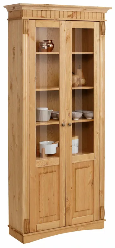 Aus FSC®-zertifizierter massiver Kiefer mit sichtbarer Holzmaserung. Fräsungen, Zierborten und ein edler, hervorgehobener Kranzabschluss machen die Front zum Blickfang. Fünf Einlegeböden bieten flexibel nutzbaren Stauraum – ideal zur stilvollen Aufbewahrung und Präsentation. Mit 193 cm Höhe bietet die Vitrine großzügigen Stauraum, ohne dabei überladen zu wirken. Typisch Landhaus: Natürliche Materialien, liebevolle Details und ein wohnlicher, zeitloser Charakter