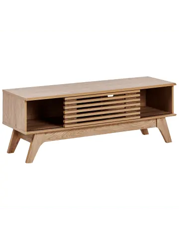 Niedriger, schmaler TV-Schrank mit Schiebetür in edler Lamellenoptik. Unser Fernsehschrank wird Sie mit seinem ausgefallenen Design und dem hellen Eichenholzfarbton begeistern. Dieses Schränkchen überzeugt durch eine elegante Ausstrahlung und hochwertige Qualität. Dieses Mediamöbel hat zwei Fächer, wovon ein Fach offen ist und das andere mit einer Schiebetür versehen ist. Mit der Schiebetür lässt sich jeweils eines der beiden Fächer schließen. Die Holzstreben, welche in kleinen Abständen an der Schiebetür angebracht sind, geben dem Fernsehschrank einen offenen Charakter.Details: Typ: TV-Möbel Farbe: Braun Material: Faserplatte Gestellmaterial: Holzwerkstoff Tischplattenmaterial: Holzwerkstoff Anzahl Einlegeböden: 2 Türöffnungsarten: Schiebetür Schubladen: Nein Finish: Matt Türanzahl: 1Dimensions: Tiefe: 40 cm Breite: 120 cm Höhe: 44 cm Gewicht: 17 kg Max. Belastung pro Fach: 5 kg Max. Belastung der Oberplatte: 80 kgSie kaufen: 1 x TV-MöbelProduktvorteile: Funktionale Schiebetüren, Retro Stil, Holzähnliches Finish für einen möglichst naturnahen Look, Solide Verarbeitung, Rutschfester StandMontage: Nicht montiert. 45 – 60 Min.Zusatzinformationen: Um die Haltbarkeit und die Ästhetik der Arbeitsplatte zu erhalten, sollte man Platzsets und Untersetzer verwenden und feuchte Stellen schnellstmöglich trocken wischen, um Produktschäden zu vermeiden.Pflegeanleitung:Faserplatte: 1.Bitte ausschließlich milde Reinigungsmittel und weiche Tücher verwenden. Feuchte Stellen sofort trocken reiben.