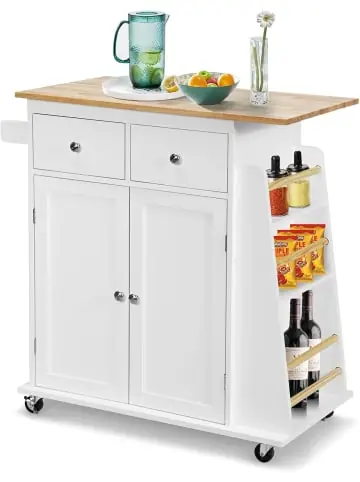 Beschreibung: Ausgestattet mit einer breiten Massivholz-Arbeitsplatte, einem 2-türigen Schrank, 2 Schubladen, einem Handtuchhalter und einem 3-stöckigen Gewürzregal bietet diese Kücheninsel auf Rollen ausreichend Stauraum für Ihre Küchenutensilien und kann diese gut organisiert aufbewahren. Das Regal im Inneren des Schranks kann auf 3 verschiedene Positionen eingestellt werden, um unterschiedlichen Aufbewahrungsanforderungen gerecht zu werden. Der seitliche Handtuchhalter kann auch als praktischer Schiebegriff verwendet werden. Aus massivem Gummibaumholz und strapazierfähigem MDF gefertigt, sorgt dieser Küchenwagen für hervorragende Stabilität, Belastbarkeit und eine lange Lebensdauer.Eigenschaften: Die geräumige Arbeitsplatte aus massivem Kautschukholz eignet sich perfekt für die Zubereitung von Speisen Hergestellt aus hochwertigem MDF, um Stabilität und Langlebigkeit zu gewährleisten Schrank mit 3-fach verstellbarem Einlegeboden für flexible Aufbewahrung Das 3-stöckige Gewürzregal ist praktisch, um Gegenstände leicht zugänglich zu machen Leichtgängige Schubladenführungen und exquisite Knäufe zum leichten Herausziehen der Schublade Funktioneller Magnetverschluss hält die Schranktür fest geschlossen Der Handtuchhalter kann als Griff zum Schieben des Küchenwagens verwendet werden Einfach zu bewegen mit 4 um 360° schwenkbaren Rädern, 2 davon mit Bremsen Glatte Farbe: Weiß Material: MDF + Gummiholz Produktgröße: 88 cm x 46 cm x 89,5 cm (L x B x H) Größe der Arbeitsplatte: 80 cm x 45 cm (L x B) Maximales Gewicht der oberen Platte: 30 kg Maximales Gewicht der unteren Platte: 15 kg Maximales Gewicht des Innenregals: 10 kg Nettogewicht: 28 kgLieferungsumfang: 1 x Küchenwagen 1 x Anleitung