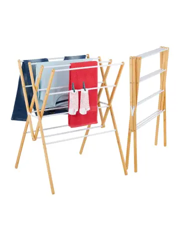 Will man seine Wäsche nach dem Waschgang trocknen, nimmt das oft viel Platz in Anspruch. Eine platzsparende Lösung bietet stattdessen dieser faltbare Standtrockner. Auf 4 Ebenen mit insgesamt 12 Stangen kannst Du Oberteile, Hosen oder Unterwäsche problemlos aufhängen. Die verschiedenen Höhen gewährleisten eine optimale Raumnutzung, was besonders für kleine Haushalte praktisch ist. Bei Nichtgebrauch lässt sich der Trockenständer flach zusammenklappen und einfach verstauen.Wäscheständer im Detail – Maße H x B x T: ca. 93 x 70 x 62 cm – Gefaltet H x B x T: ca. 100 x 70,5 x 11 cm – Traglast: max. 15 kg – Gewicht: ca. 2,2 kg – Material: Eisen, Bambus – Verschiedene Farben erhältlichKlappbarer Turmwäscheständer – Zum Trocknen und Lüften von Oberteilen, Hosen uvm. – Platzsparendes Design mit 12 Stangen auf 4 Ebenen – Mit wenigen Handgriffen zusammengeklappt und verstaut – Vor allem für kleine Wohnungen oder für Camping praktisch – Dekoratives Design aus natürlichem Bambus und mattem MetallLieferumfang – 1x Standwäschetrockner – Dekoartikel sind nicht im Lieferumfang enthalten