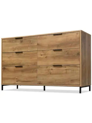 Der Würfel ist mit einer rustikalen Holzoptik versehen, die zusammen mit dem schwarzen Metallrahmen für ein wahrhaft industrielles Design der Schubladenkommode sorgt.In den sechs funktionalen Schubladen mit einem Innenvolumen von H11/B33/T52,5 cm können Sie Kleidung und andere Dinge sortieren.Unsere verstellbaren Schrauben können Ihnen helfen, die Höhe Ihrer Schubladenkommode einzustellen, es wird keinen Schaden und keine Kratzer auf Ihren Böden verursachen.Die Produktfüße von dem feuchten Boden fernhalten, effektiv die Füße und den Boden schützen, um es ordentlich und schön zu halten.Die Kommode wurde als langlebiges Möbelstück konzipiert, da sie aus hochwertigem Holz gefertigt wurde, mit exzellenter Schiene, alles für eine komfortable Nutzung.Es wird in 2 flachen Paketen geliefert und kann leicht in den Raum Ihrer Wahl gebracht werden.Die mitgelieferte detaillierte Anleitung führt Sie durch den Montageprozess und macht den Aufbau zu einem stressfreien Erlebnis!