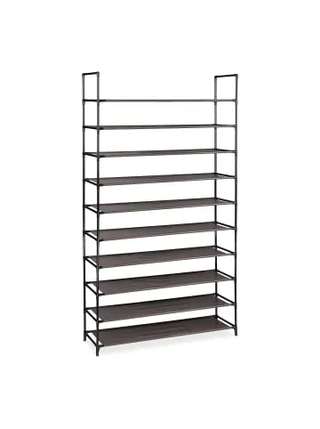 Die hohe XXL Schuhablage bietet idealen Stauraum für den Flur oder das Treppenhaus. Auf den 10 breiten Ablagen aus Vlies können insgesamt – je nach Größe – bis zu 50 Paar Schuhe abgestellt werden. Das XXL Stecksystem Schuhregal ist offen und minimalistisch gehalten. Dank des Metall-Gestells ist es sehr solide. Der Aufbau geht durch das simple Stecksystem leicht von der Hand. Die Konstruktion kann nach Belieben angepasst werden – je nach Ihren Wünschen lässt sich die Höhe auch reduzieren.Schuhregal Stecksystem im Detail – Maße gesamt H x B x T: ca. 176,5 x 99 x 29,5 cm – Maße je Ebene B x T: ca. 96,5 x 27 cm – Abstand zwischen Ablagen: ca. 16 cm – Bodenfreiheit: ca. 5,5 cm – Traglast pro Ebene: ca. 5 kg – Gewicht: ca. 2,8 kg – Material: Eisen, Vliesstoff, Kunststoff – In verschiedenen Farben erhältlichErweiterbare Schuhablage – Sandaletten, Sneakers, Ballerinas verstauen – Auf 10 Etagen Platz für bis zu 50 Paar Schuhe – Bei Kinderschuhen mehr – Schlicht, praktisch und einfach montiert ohne Werkzeug – Sehr leicht und beweglich – Somit auch ideal für Camping – Höhe kann beliebig angepasst werdenLieferumfang – 1x Schuhregal in Einzelteilen – Inklusive Aufbauanleitung und Montagematerial – Dekoartikel sind nicht im Lieferumfang enthalten