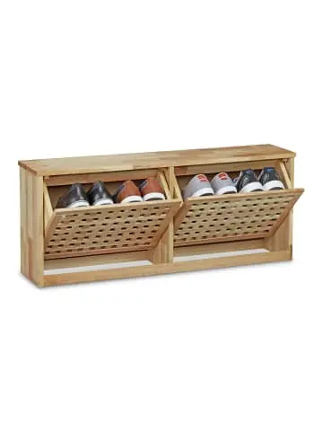 Schaffen Sie Platz in Ihrem Flur und verstauen Sie Ihr Schuhwerk in diesem schicken wie praktischen Kipp-Schuhregal aus Walnuss. Die einzelnen Kippfächer sind schräg angebracht und lagern Ihre Schuhe auf ansprechende Art und Weise. Der natürliche Ton des Holzes verströmt schlichte Schönheit und passt sich perfekt in die Diele und das Treppenhaus ein. Jedes Fach bietet bis zu maximal 2 Paar Schuhen Platz. Details des Schuhkippers Walnuss• Größe gesamt H x B x T: ca. 38 x 94 x 20 cm• Schubfach Innenmaße H x B x T: ca. 29 x 40 x 15 cm• Gewicht: ca. 7,5 Kg• Massives Walnuss Holz von hochwertiger Qualität• Schubladenboden und Rückwand aus MDFLieferumfang• 1x Schuhregal• Kippfächer• Anleitung • Dekorationsartikel sind im Lieferumfang nicht enthalten