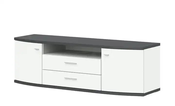 Ob für den Fernseher oder für andere Dinge, das Lowboard Gabbro bietet viel Platz. Stauraum bietet es hinter den beiden Türen links und rechts und den beiden mittigen Schubladen. Darüber hinaus steht Ihnen ein offenes Fach zur Verfügung. Hier könnte zum Beispiel ein DVD-Player stehen. Das zweifarbige Design macht Gabbro auch optisch zum Highlight. Das Dekor von Oberplatte und Boden rahmt das Weiß von Front und Korpus ein. Die Front ist außerdem hochglänzend.