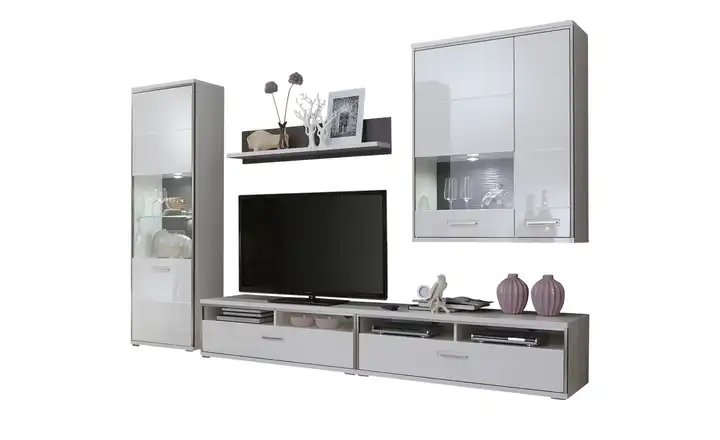 Die Wohnwand Setto von uno ist ein optisches und praktisches Highlight für Ihren Wohnraum. Setto ist in einem puristischen Weiß gehalten – und wird durch graue Akzente abgesetzt. Sie stellen einen schönen Kontrast zum Weiß dar. Hinzu kommen Akzent-Rahmen in Edelstahloptik. Die Wohnwand besteht aus fünf Elementen, die Sie nach Herzenslust platzieren können. So bietet Ihnen Setto diverse Gestaltungsmöglichkeiten. Wie Sie sich auch entscheiden, mit Setto erhalten Sie praktischen Stauraum für alles, was Sie unterbringen möchten. Auch Stellfläche für Ihren Fernseher und weitere Ablagen sind vorhanden. Präsentieren Sie Lieblingsdeko hinter Glas. Die Vitrinenfächer machen es möglich.