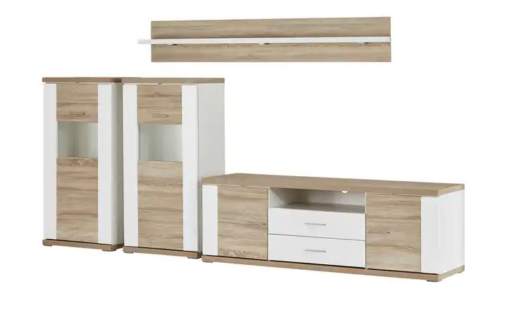 Weiß und helle Holzdekore sehen toll zusammen aus. So wie bei der Wohnkombination Titan von uno. Sie ist in Eiche sägerau (Nachbildung) und Weiß designt. Die weißen Fronten haben einen hübschen Hochglanz – ein Kontrast zu der geriffelten Front des Dekors. Durch die LED-Beleuchtung kommt die dekorative Frontoptik noch besser zur Geltung. Zu der Kombi gehören zwei Vitrinen, ein TV-Lowboard und ein passendes Wandpaneel. Die diversen Elemente bieten Stauraum und freie Ablageflächen. In den Vitrinen können Sie Ihre Lieblingstücke präsentieren.